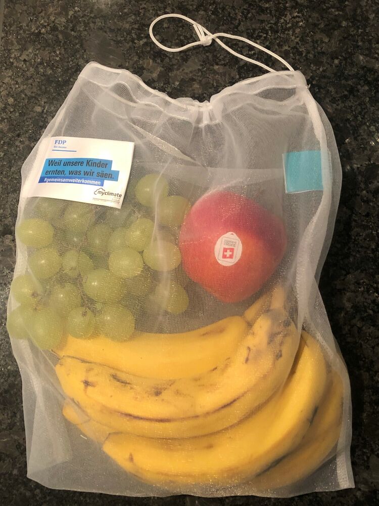 • Die Kantonalpartei hat als Werbeartikel für die Kandidierenden ein wiederverwendbares «Früchte- und Gemüsesäckli» aus Nylon angeschafft. Mit dem FDP-Säckli kann beim Einkauf von Früchten und Gemüse im Supermarkt auf die Wegwerfsäckli aus Plastik verzichtet werden. Produktion und Transport des Artikels wurden CO2-kompensiert und das Produkt trägt das Label der Stiftung «myclimate».